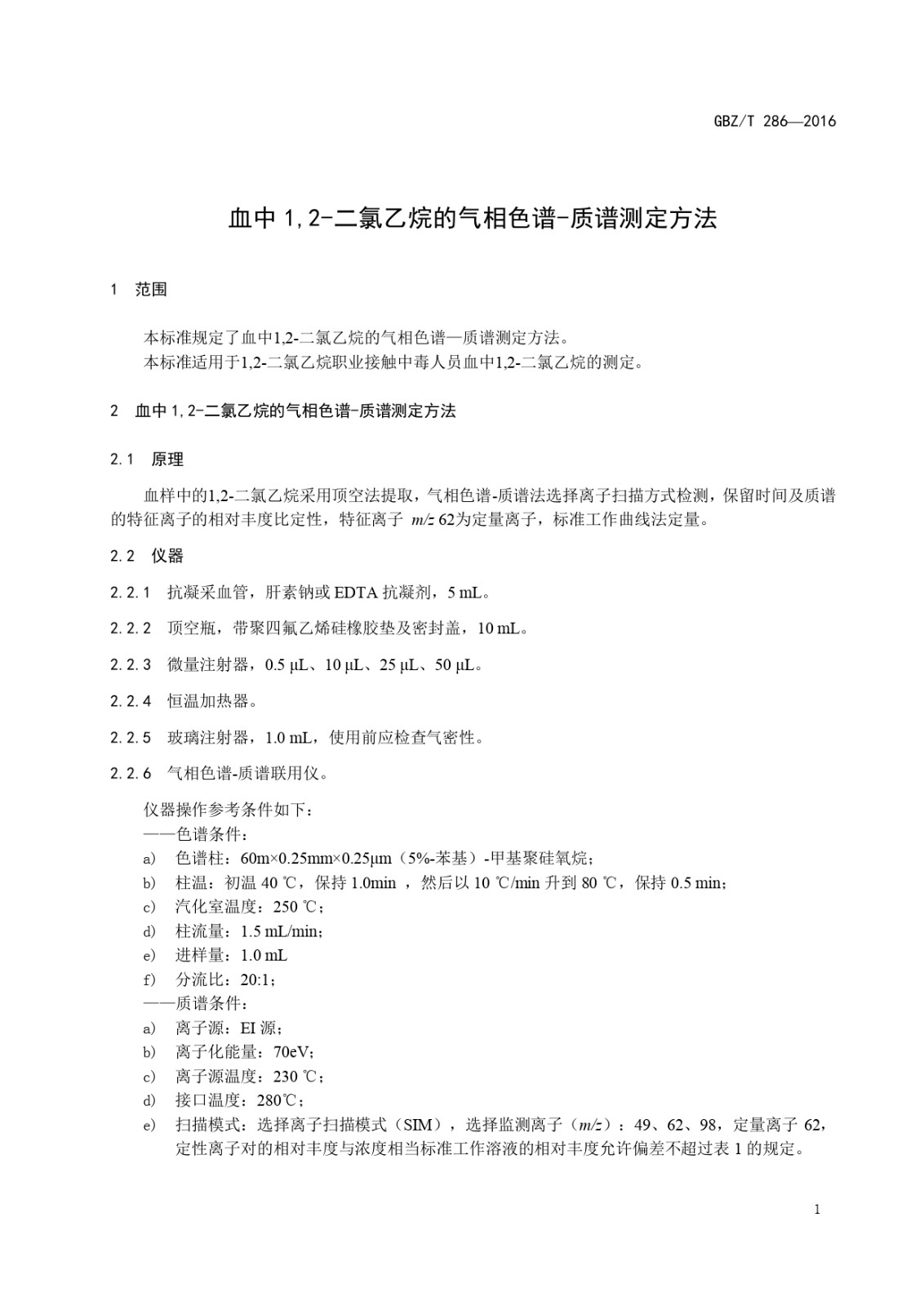 GBZT 286-2016 血中1,2—二氯乙烷的氣相色譜—質(zhì)譜測定方法